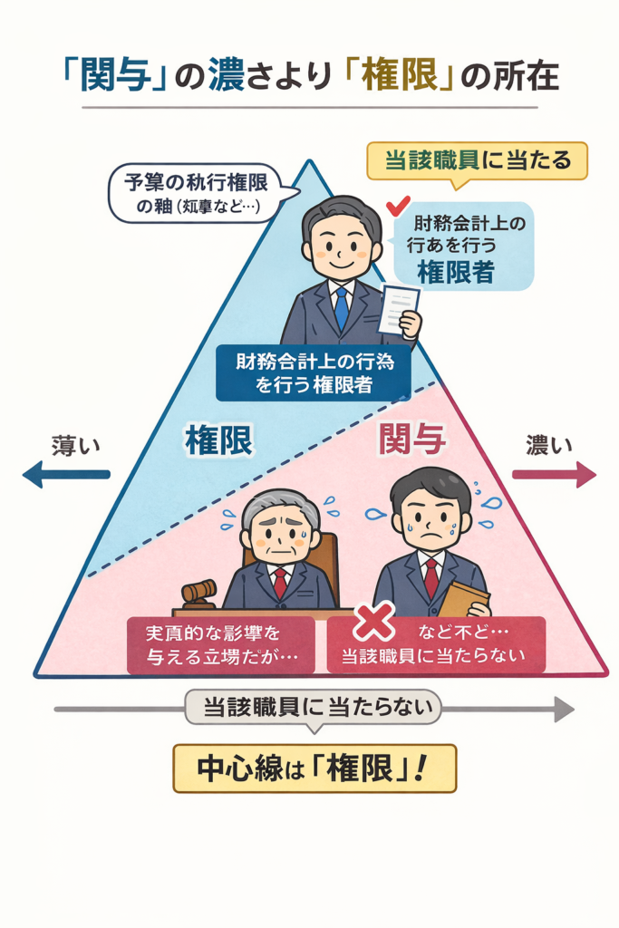 最高裁は、住民訴訟制度の目的(違法な財務会計行為等を予防・是正して、地方財務行政の適正運営を確保する)から逆算し、当該職員の射程をこう整理します。