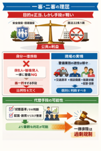 反対意見側の問題意識を象徴するのが、「他法令の改正準備がそろうのを待って一括して整備する合理性は否定しないが、それで“個別に検討しなくてよい”にはならない」「平等保護原則と職業選択の自由が不合理に損なわれている状態が条文上あらわなら、法体系全体の一括改正を待たずに、必要なところには別途措置を講ずるべきだった」という趣旨の指摘である。